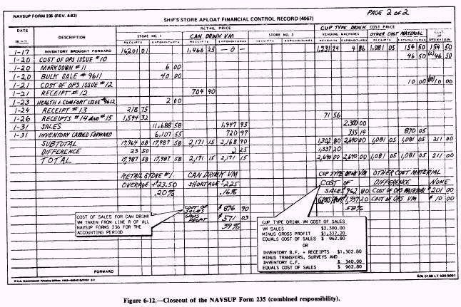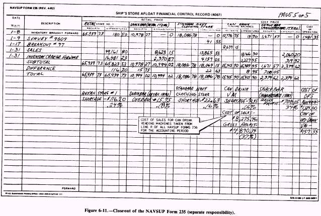 CLOSEOUT PROCEDURE The NAVSUP Form 235 is balanced and closed out at the end of the accounting period and at any other time directed by the commanding officer. Balancing and closing out the NAVSUP Form 235 is a very important job, and accuracy is of the utmost importance because accuracy determines whether a ship's store activity is short or over. It is especially important to the responsible custodian, since he or she is held responsible and can be punished under the Uniform Code of Military Justice (UCMJ) for any excessive differences. In addition, the NAVSUP Form 235 must be balanced but not closed out when any of the following events occurs: l An inventory is taken to determine the financial status of a sales outlet or bulk storeroom (for example, when you take monthly inventory in a self-service store and sales outlet operated by more than one person). l The ship's store officer is relieved during the accounting period and returns are not submitted. . The responsible custodian is relieved; the appropriate column on the NAVSUP Form 235 is balanced. ROM users first enter inventory data for each retail outlet in the ROM inventory function. After this data is entered, the ROM balances the NAVSUP Form 235 and ROM users process the NAVSUP Form 235 in the ROM reports function. In figures 6-11 and 6-12, the procedures for closing out the NAVSUP Form 235 manually are shown for both separate and combined responsibility. It looks like a difficult task, but all it involves is transferring figures, adding columns, and figuring the percentage of differences. Follow along and study each figure as we discuss the entries made during the closeout of the NAVSUP Form 235. Sales Entry Sales is the first entry made during closeout for each ship's store activity. After sales, enter the cash collected for each sales outlet during the accounting period in the Expenditure column, Obtain the cash sales figure from the Cash Register Record, NAVSUP Form 469, for each individual sales outlet. The ROM system automatically enters this information. Inventory Carried Forward Entry Inventory carried forward is the second entry made during closeout of the NAVSUP Form 235. For all sales outlets except cup-type vending machines and snack bar manufactured items, enter the closing inventory at retail in the correct Expenditure column. For cup-type vending machines and snack bar manufactured items, enter the closing inventory at cost price in the correct Expenditure column. Obtain these closing inventory figures from the inventory summary sheet for each sales outlet. The ROM system automatically enters this information. Subtotal Entry Subtotal is the third entry made during closeout of the NAVSUP Form 235. Add all the entries in the Receipt and Expenditure columns, including the sales figure and inventory carried forward for each activity, and enter the totals. The ROM system computes the subtotal automatically. Difference Entry Enter the amount of difference in the Receipt and Expenditure columns necessary to make the two columns equal. An amount in the Receipt column indicates an overage, while an amount in the Expenditure column indicates a shortage. For cup-type vending machines, the amount reported on this line is the gross profit. The ROM automatically computes the difference.