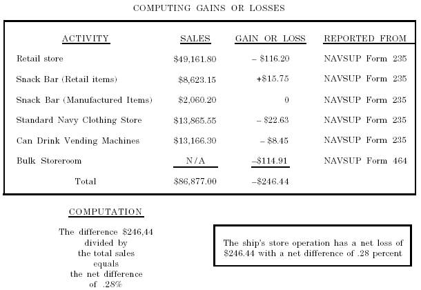 Figure 6-13.-Computing gains and losses. 6-23 The first step taken to resolve the difference is an attempt to take care of the shortage or overage at a divisional level. This is done by verifying all mathematical computations on the records and using the checkoff list in the NAVSUP P-487, par. 9102, that indicates the most common discrepancies that occur. If this does not resolve the problem, then the commanding officer must be notified. The commanding officer initiates an informal examination of the loss that includes rechecking the most common errors shown in the NAVSUP P-487 and determining the total dollar value of the difference based on inventory and financial control records closeout. If this informal investigation determines there is no excessive loss, no further action is required. If the excessive difference is not resolved, the following actions are taken: . Assistance is requested from the TYCOM or local NAVRESSO fleet assistance team. . Accountability is reestablished and spaces are reopened for business. l Disciplinary action is taken according to the UCMJ, if required. . If theft or fraud is discovered, the instructions in the NAVSUP P-487, par. 1206 (2) and (3), are followed. This information is now available on CD in Adobe PDF Printable Format |