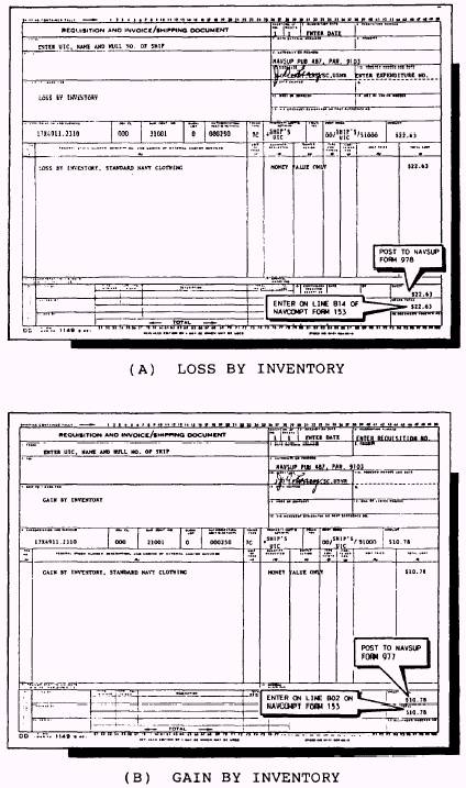 Reporting Differences When the informal investigation indicates an excessive difference, a letter is sent to the TYCOM with a copy to the fleet commander, to NAVSUP, to the Navy Accounting and Finance Center, to NAVRESSO, and to the Naval Supply Corps School at Athens. A copy of the NAVSUP Form 235 and the discrepancy list must be enclosed with the letter explaining possible causes and corrective action taken to prevent the difference from happening again. When directed by NAVRESSO and with the type commander concurrence, special inventory requirements may be implemented. The entire ship's store operation must be inventoried and balanced monthly for a minimum of 4 months to make sure there are no problems. Duplicates of the NAVSUP Forms 235 and 236 must be sent to NAVRESSO and the TYCOM each month during this period. Disproportionate Difference A disproportionate difference is an existing excessive difference that cannot be resolved and that exceeds $2,250 or 3 percent of sales, whichever is greater. The procedures for reviewing a disproportionate difference are the same as for excessive differences. If, after the informal investigation is done, the difference is not resolved, a request for assistance is submitted to the local TYCOM or the NAV-RESSO fleet assistance team. If they do not resolve the difference or it cannot be done in a reasonable time period, the following steps are taken: . Set up a formal fact-finding body according to the JAG Manual, par. 0909. . Relieve the responsible custodian if indications show him or her to be responsible. . Reopen the records; in the event the ship's store officer is relieved, the records are closed and the relieved officer submits returns. . Reopen spaces for business. The requirements we discussed earlier under reporting differences apply to disproportionate differences also. ACCOUNTING FOR GAINS OR LOSSES A gain or loss by inventory that cannot be resolved must be accounted for in order to bring the ship's store records into agreement. In this section we discuss how to account for gains or losses of ship's store or standard Navy clothing stock. Ship's Store Stock All gains or losses of ship's store stock are absorbed in the cost of sales retail on the Journal of Expenditures, NAVSUP Form 978, at the end of the accounting period. This includes standard Navy clothing stock sold with ship's store stock through the same cash register with nondepartmental keys. If the descriptions of items missing from the sales outlet are known, a survey charging the individual ship's store profits is prepared. Standard Navy Clothing Stock Gains or losses of standard Navy clothing stock are credited or charged to the Navy Stock Fund. This includes gains or losses found as a result of inventories in the bulk storeroom, or gains or losses in a sales outlet when standard Navy clothing items are sold in a separate store or through a cash register with departmental keys. The actual gain or loss by inventory is documented on a Requisition and Invoice/ Shipping Document, DD Form 1149, for money value only. The DD Form 1149 covering gains or losses by inventory is shown in figure 6-14. If it