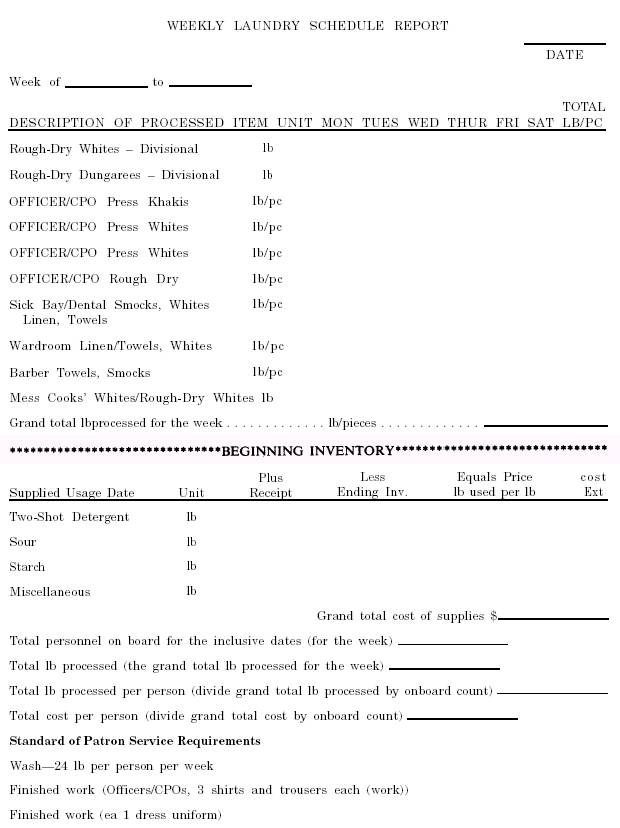 Figure 7-2.-Laundry summary sheet. If the previous laundry supervisor did not keep this summary sheet, or did not keep the laundry logs properly, it may make your preparation of the laundry schedule more difficult. In this case, use your past experiences plus other factors that determine laundry scheduling to prepare a workable and effective schedule. You may have to adjust the schedule periodically for smooth operations. This information is now available on CD in Adobe PDF Printable Format |