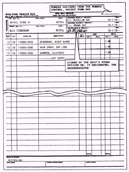 Figure 2-5.-The lntra-Store Transfer Data, NAVSUP Form 973. the time of request, a control number is automagically assigned to the NAVSUP Form 973. After the NAVSUP Form 973 is prepared, there are certain procedures that you must follow when using it. First, the document must be distributed properly. The original and duplicate copy are given to the bulk storeroom custodian to issue the stock. The triplicate copy is retained by the recordskeeper. The quadruplicate copy is given to the sales outlet or service activity operator receiving the stock. On receipt of the original and duplicate copy of the NAVSUP Form 973, the bulk storeroom custodian will break out the stock. The bulk storeroom custodian must record the quantities broken out on the two documents and sign and forward the original to the office recordskeeper while retaining the duplicate copy for his or her records. The sales outlet or service activity operator will not have access to the original or the duplicate copy. Once the stock is received in the sales outlet or service activity, the operator records the quantities received on the quadruplicate copy of the NAVSUP Form 973, acknowledges receipt of the stock by signing the quadruplicate copy, and forwards it directly to the recordskeeper. In manual recordskeeping, once the recordskeeper receives both the original and quadruplicate copies, the quantities broken out and received will be compared. If there are no differences, the quantities received will be circled on the original and entered and circled on the triplicate copy. The sales outlet or service activity operator will sign the original and the triplicate copy. The original will be forwarded to the ship's store officer for extensions and compared with the triplicate copy. It will then be filed in the Accountability File, SSA-21. The recordskeeper will use the triplicate copy for posting the records. If there are no discrepancies between the original and the quadruplicate copy in ROM procedures, the quantities received will be circled on the original and the triplicate copy of the intrastore transfer request. The original and triplicate copies are signed by the sales outlet or service activity operator receiving the stock. The recordskeeper will then enter the information into the ROM and generate and print the final intrastore transfer. The original of the final intrastore transfer is matched with the original of the intrastore transfer request. Both documents are then forwarded to the ship's store officer and filed in the Accountability File, SSA-21. The triplicate copy along with the final intrastore transfer are filed in the Number Control and Breakout File, SSA-2. The quadruplicate copy is returned to the person receiving the stock. If a discrepancy is noted between what the bulk storeroom custodian broke out and what the sales outlet or service activity operator received, an inventory will be conducted immediately of the item in the bulk storeroom and the count compared against the corresponding Stock Record, NAVSUP Form 464. After reaching an agreement on the actual quantities broken out, the bulk storeroom custodian and the sales outlet or service activity operator will correct and initial all copies of the NAVSUP Form 973. If an agreement cannot be reached, the ship's store officer will make the final determination based on all known circumstances and initial the changes on the NAVSUP Form 973. When ROM users note a discrepancy between the quantities broken out and received, the problem is taken care of in the same manner as discussed previously in manual procedures. ROM users will enter changes to the amounts broken out on the original intrastore transfer request to the final intrastore transfer. The recordskeeper will print the final intrastore transfer and compare it to the original intrastore transfer request to make sure they match. The documents are then filed as discussed earlier. FILE SSA-3 File SSA-3 is the journal of receipts and journal of expenditures file. This file contains the NAVSUP Forms 977 and 978. This information is now available on CD in Adobe PDF Printable Format |