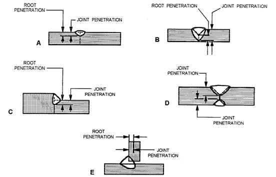 PARTS OF JOINTS While there are many variations of joints, the parts of the joint are described by standard terms. The root of a joint is that portion of the joint where the metals are closest to each other. As shown in figure 3-7, the root may be a point, a line, or an area, when viewed in cross section. A groove (fig. 3-8) is an opening or space provided between the edges of the metal parts to be welded. The groove face is that surface of a metal part included in the groove, as shown in figure 3-8, view A. A given joint may have a root face or a root edge. The root face, also shown in view A, is the portion of the prepared edge of a part to be joined by a groove weld that has not been grooved. As you can see, the root face has relatively small dimensions. The root edge is basically a root face of zero width, as shown in view B. As you can see in views C and D of the illustration, the groove face and the root face are the same metal surfaces in some joints. The specified requirements for a particular joint are expressed in such terms as bevel angle, groove angle, groove radius, and root opening. A brief description of each term is shown in figure 3-9. The bevel angle is the angle formed between the prepared edge of a member and a plane perpendicular to the surface of the member. The groove angle is the total angle of the groove between the parts to be joined. For example, if the edge of each of two plates were beveled to an angle of 30 degrees, the groove angle would be 60 degrees. This is