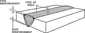 Figure 3-11.-Weld reinforcement. often referred to as the "included angle" between the parts to be joined by agroove weld. The groove radius is the radius used to form the shape of a J- or U-groove weld joint. It is used only for special groove joint designs. The root opening refers to the separation between the parts to be joined at the root of the joint. It is sometimes called the "root gap." To determine the bevel angle, groove angle, and root opening for a joint, you must consider the thickness of the weld material, the type of joint to be made, and the welding process to be used. As a general rule, gas welding requires a larger groove angle than manual metal-arc welding. The root opening is usually governed by the diameter of the filler material. This, in turn, depends on the thickness of the base metal and the welding position.