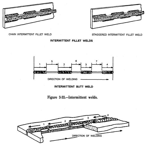 Figure 3-34.-Back-step welding. Proper Edge Preparation and Fit-up As discussed earlier in this chapter, proper edge preparation and fit-up are essential to good quality welds. By making certain the edges are properly beveled and spacing is adequate, you can restrict the effects of distortion. Additionally, you should use tack welds, especially on long joints. Tack welds should be spaced at least 12 inches apart and run approximately twice as long as the thickness of the weld. Control the Heat Input You should understand that the faster a weld is made, the less heat is absorbed by the base metal. As you gain welding experience, it will become easier for you to weld a seam with the minimum amount of heat by simply speeding up the welding process. Regardless of your experience, it is often necessary to use a welding technique designed to control heat input. An intermittent weld (sometimes called a skip weld) is often used instead of one continuous weld. When you are using an intermittent weld, a short weld is made at the beginning of the joint. Next, you skip to the center of the seam and weld a few inches. Then, you weld at the other end of the joint. Finally, you return to the end of the first weld and repeat the cycle until the weld is finished. Figure 3-33 shows the intermittent weld. Another technique to control the heat input is the back-step method (fig. 3-34). When using this technique, you deposit short weld beads from right to left along the seam. Preheat the Metal As discussed earlier, expansion and contraction rates are not uniform in a structure during welding due to the differences in temperature throughout the metal.