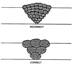 Figure 3-35.-Weld passes. To control the forces of expansion and contraction, you preheat the entire structure before welding. After the welding is complete, you allow the structure to cool slowly. More about preheating and postheating is discussed later in this training manual. Limit the Number of Weld Passes You can keep distortion to a minimum by using as few weld passes as possible. You should limit the number of weld passes to the number necessary to meet the requirements of the job. (See fig. 3-35.) Use Jigs and Fixtures Since holding the metal in a fixed position prevents excessive movements, the use of jigs and fixtures can help prevent distortion. A jig or fixture is simply a device used to hold the metal rigidly in position during the welding operation. Allow for Distortion A simple remedy for the distortion caused by expansion and contraction is to allow for it during fit-up. To reduce distortion, you angle the parts to be welded slightly in the opposite direction in which the contraction takes place. When the metal cools, contraction forces pull the pieces back into position. Figure 3-36 shows how distortion can be overcome in both the butt and tee joints. There is more to being a good welder than just being able to lay a good bead. There are many factors that must