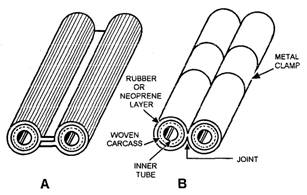 HOSES The hoses used to make the connections between the torch and the regulators must be strong, nonporous, light, and flexible enough to make torch movements easy. They must be made to withstand internal pressures that can reach as high as 100 psig. The rubber used in hose manufacture is specially treated to remove the sulfur that could cause spontaneous combustion. Welding hose is available in single- and doublehose lengths. Size is determined by the inside diameter, and the proper size to use depends on the type of work for which it is intended. Hose used for light work has a 3/16 or 1/4 inch inside diameter and one or two plies of fabric. For heavy-duty welding and cutting operations, use a hose with an inside diameter of 5/16 inch and three to five plies of fabric. Single hose is available in the standard sizes as well as 1/2-, 3/4-, and 1-inch sizes. These larger sizes are for heavy-duty heating and for use on large cutting machines. The most common type of cutting and welding hose is the twin or double hose that consists of the fuel hose and the oxygen hose joined together side by side. They are joined together by either a special rib (fig. 4-10, view A) or by clamps (fig. 4-10, view B). Because they are joined together, the hoses are less likely to become tangled and are easier to move from place. The length of hose you use is important. The delivery pressure at the torch varies with the length of the hose. A 20-foot, 3/16-inch hose maybe adequate for a job, but if the same hose was 50 feet long, the pressure drop would result in insufficient gas flow to the torch. Longer hoses require larger inside diameters to ensure the correct flow of gas to the torch. When you are having problems welding or cutting, this is one area to check The hoses used for fuel gas and oxygen are identical in construction, but they differ in color. The oxygen hose cover is GREEN, and the fuel-gas hose cover is RED. This color coding aids in the prevention of mishaps that could lead to dangerous accidents.