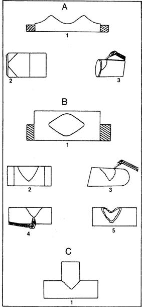 Figure 4-28.-Fabricating a T. In that case, the first step involves cutting the pipe at a 90-degree angle. In the second step, you bevel the edge of the cut to a 45-degree angle. With the two-step procedure, you must mark an additional line on the pipe. This second line follows the contour of the line traced around the pattern, but it is drawn away from the original pattern line at a distance equal to the thickness of the pipe wall. The first (90-degree) cut in the two-step procedure is made along the second line. The second (45-degree) cut is made along the original pattern line. The primary disadvantage of the two-step procedure is it is time consuming and uneconomical in oxygen and gas consumption. The one-step method of cutting and beveling pipe is not difficult, but it does require a steady hand and a great deal of experience to turn out a first-class job. An example of this method for fabricating a T is shown in figure 4-28. View A of figure 4-28 outlines the step-bystep procedures for fabricating the branch; view B shows the steps for preparing the main section of the T; and view C shows the assembled T, tack-welded and ready for final welding. Step 3 of view A shows the procedure for cutting the miter on the branch. You should begin the cut at the end of the pipe and work around until one half of one side is cut. The torch is at a 45-degree angle to the surface of the pipe along the line of cut. While the tip is at a 45-degree angle, you should move the torch steadily forward, and at the same time, swing the butt of the torch upward through an arc. This torch manipulation is necessary to keep the cut progressing in the proper direction with a bevel of 45 degrees at all points on the miter. Cut the second portion of the miter in the same reamer as the first. The torch manipulation necessary for cutting the run of the T is shown in Steps 3 and 4 of view B in figure 4-28. Step 3 shows the torch angle for the starting cut and Step 4 shows the cut at the lowest point on the pipe. Here you change the angle to get around the sharp curve and start the cut in an upward direction. The completed cut for the run is shown in Step 5 (fig. 4-28, view B). Before final assembly and tack welding of any of the parts of a fabricated fitting, you must clean the slag from the inner pipe wall and check the fit of the joint. The bevels must be smooth and have complete fusion when you weld the joint. |