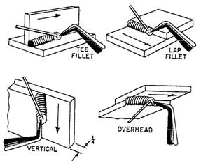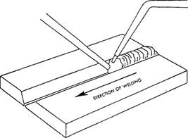 Figure 5-9.-Backhand welding. Less motion is used in the backhand method than in the forehand method. If you use a straight welding rod, you should rotate it so the end rolls from side to side and melts off evenly. You might have to bend the rod when working in confined spaces. If you do, it becomes difficult to roll a bent rod, and to compensate, you have to move the rod and torch back and forth at a rather rapid rate. When making a large weld, you should move the rod so it makes complete circles in the molten puddle. The torch is moved back and forth across the weld while it is advanced slowly and uniformly in the direction of the welding. The backhand method is best for welding material more than 1/8 of an inch thick. You can use a narrower vee at the joint than is possible in forehand welding. An included angle of 60 degrees is a sufficient angle of bevel to get a good joint. The backhand method requires less welding rod or puddling as the forehand method. By using the backhand technique on heavier material, you can increase your welding speed, better your control of the larger puddle, and have more complete fusion at the weld root. If you use a slightly reducing flame with the backhand technique, a smaller amount of base metal is melted while welding the joint. When you are welding steel with a backhand technique and a slightly reducing flame, the absorption of carbon by a thin surface layer of metal reduces the melting point of the steel. This speeds up the welding operation, This technique is also used in surfacing with chromium-cobalt alloys. MULTILAYER WELDING is used in order to avoid carrying too large a puddle of molten metal when welding thick plate and pipe. Large puddles are difficult to control. Concentrate on getting a good weld at the bottom of the vee in the first pass. Then, in the next layers, concentrate on getting good fusion with the sides of the vee and the previous layer. The final layer is easily controlled to get a smooth surface. This method of welding has an added advantage in that it refines the previous layer as the succeeding layer is made. In effect, it heat-treats the weld metal by allowing one layer to cool to a black heat before it is reheated This improves the ductility of the weld metal. If this added quality is desired in the last layer, an additional or succeeding layer is deposited and then machined off. |
