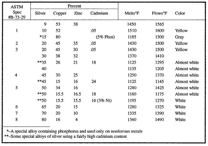 Silver Brazing Often, you will be called on to do a silver brazing job. Table 6-2 lists different types of silver brazing alloys and their characteristics. A popular way to apply silver brazing metal on a tubing is to use silver alloy rings, as shown in figure 6-17. This is a practical and economical way to add silver alloy when using a production line system. Another method of brazing by using preplaced brazing shims is shown in figure 6-18. The requirements of each job varies; however, through experience you can become capable of selecting the proper procedure to produce quality brazing. |