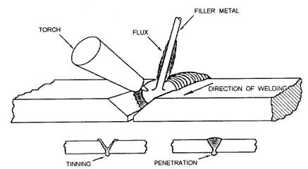 BRAZE WELDING PROCEDURES Edge preparation is essential in braze welding. The edges of the thick parts can be beveled by grinding, machining, or filing. It is not necessary to bevel the thin parts (one-fourth inch or less). The metal must be bright and clean on the underside as well as on the top of the joint. Cleaning with a file, steel wool, or abrasive paper removes most foreign matter such as oil, greases, and oxides. The use of the proper flux completes the process and permits the tinning to occur. After you prepare the edges, the parts need to be aligned and held in position for the braze welding process. This can be done with clamps, tack welds, or a combination of both. The next step is to preheat the assembly to reduce expansion and contraction of the metals during welding. The method you use depends upon the size of the casting or assembly. Once preheating is completed, you can start the tinning process. Adjust the flame of the torch to a slightly oxidizing flame and flux the joint. Through experience, you will find that the use of more flux during the tinning process produces stronger welds. Apply heat to the base metal until the metal begins to turn red. Melt some of the brazing rod onto the surface and allow it to spread along the entire joint. You may have to add more filler metal to complete the tinning. Figure 6-19 shows