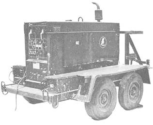 Figure 7-1.-A 300 amp ac/dc portable welding machine. VOLT.- A volt is the force required to make the current flow in an electrical circuit. It can be compared to pressure in a hydraulic system. Volts are measured with a volt meter. Power Source The power source used in arc welding is called a welding machine or a welder. Three basic types of welding machines are presently in use: motorgenerators, transformers, and rectifiers. MOTOR-GENERATOR WELDING MACHINES.- These types of welding machines are powered by electrical, gasoline, or diesel motors. The diesel and gasoline motors are ideal for use in areas where electricity is not available. Portable gas/diesel welding machines are part of the equipment allowance for Naval Mobile Construction Battalions. These machines usually have the capability of generating alternating or direct current. On the newer machines, when you are welding in the directcurrent mode, the polarity can be changed by turning a switch. Some of the older machines require reversing the cable connections. One of the advantages of a direct-current (dc) welding generator is that you have the choice of welding with either straight or reverse polarity. The welding machine, as shown in figure 7-1, consists of a heavy-duty, ac/dc 300 amp generator powered by a diesel engine. The generator is also capable of producing 3 kilowatts of 60 cycle ac power. Welding machines are made in six standardized ratings for general purposes and are listed as follows: