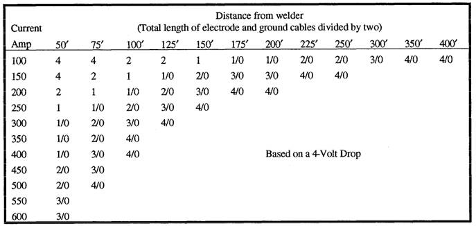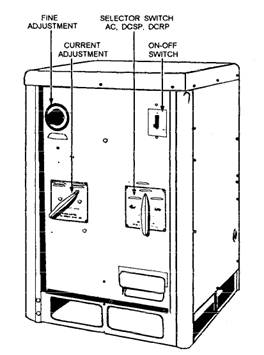 Figure 7-2.-An ac arc-welding transformer. 1. Machines rated 150 and 200 amperes-30 volts are for light-shielded metal-arc welding and for inertgas arc welding. They are also for general-purpose jobs or shopwork. 2. Machines rated 200,300, and 400 amperes-40 volts are for general welding purposes by machine or manual application. 3. Machines rated 600 amperes-40 volts are for submerged-arc welding or carbon-arc cutting. ALTERNATING-CURRENT TRANSFORMER WELDING MACHINES.- Practically all the alternating current (at) arc-welding machines in use are the static-transformer type, as shown in figure 72. These types of machines are the smallest, least expensive, and the lightest type of welders made. Industrial applications for manual operation use machines having 200, 300, and 400 ampere ratings. Machines with a 150-ampere rating are used in light industrial, garage, and job/shop welding. The transformers are usually equipped with arcstabilizing capacitors. Current control is provided in several ways by the welding transformer manufacturers. One such method is an adjustable reactor that is set by turning a crank until the appropriate setting is found. Another method is by plugging the electrode cable into different sockets located on the front of the machine. One major advantage of ac transformers is the freedom from arc blow, which often occurs when welding with direct-current (dc) machines. Arc blow causes the arc to wander while you are welding in corners on heavy metal or using large coated electrodes. Table 7-1.-Cable Size Selection Guide