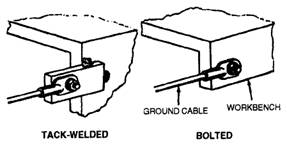 Figure 7-6.-Bolted and tack-welded ground clamps. part of the welder's equipment. After initial cleaning and a weld bead has been deposited, the slag cover must be removed before additional beads are added. The chipping hammer was specifically designed for this task. The chipping operation is then followed by more brushing, and this cycle is repeated until the slag has been removed. When the slag is not removed, the result is porosity in the weld that weakens the weld joint. Cleaning can also be accomplished by the use of power tools or chemical agents. If these items are used, it is essential that all safety precautions are followed. Safety Equipment Arc welding not only produces a brilliant light, but it also emits ultraviolet and infrared rays that are very dangerous to your eyes and skin. In chapter 3, personal safety items, such as helmets, lenses, and gloves, were covered. An important item that needs to be covered here is welding screens. The welder not only has to protect himself but he also must take precautions to protect other people who may be working close by. When you are welding in the field, you must install a welding screen around your work area. It can be an elaborate factory-manufactured screen or as simple as one constructed on site from heavy fire-resistant canvas. WARNING Never look at thes welding arc without proper eye protection. Looking at the arc with the naked eye could result in permanent eye damage. If you receive flash burns, they should be treated by medical personnel. Another area often overlooked is ventilation. Welding produces a lot of smoke and fumes that can be injurious to the welder if they are allowed to accumulate. This is especially true if you are welding in a tank or other inclosed area. Permanent welding booths should be equipped with a exhaust hood and fan system for removal of smoke and fumes. |