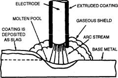 Figure 7-7.-Electrode covering and gaseous shield that protects weld metal from the atmosphere. ELECTRODES In general, all electrodes are classified into five main groups: 1. Mild steel 2. High-carbon steel 3. Special alloy steel 4. Cast iron 5. Nonferrous The widest range of arc welding is done with electrodes in the mild steel group. Electrodes are manufactured for use in specific positions and for many different types of metal. They also are specially designed to use with ac or do welding machines. Some manufacturer's electrodes work identically on either ac or dc, while others are best suited for flat-position welding. Another type is made primarily for vertical and overhead welding, and some can be used in any position. As you can see, electrode selection depends on many variables. Types of Electrodes Electrodes are classified as either bare or shielded. The original bare electrodes were exactly as their name implied-bare. Today, they have a light covering, but even with this improvement they are rarely used because of their limitations. They are difficult to weld with, produce brittle welds, and have low strength. Just about all welding is done with shielded electrodes. The shielded electrode has a heavy coating of several chemicals, such as cellulose, titania sodium, lowhydrogen sodium, or iron powder. Each of the chemicals in the coating serves a particular function in the welding process. In general, their main purposes are to induce easier arc starting, stabilize the arc, improve weld appearance and penetration, reduce spatter, and protect