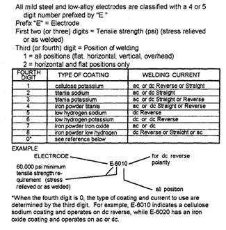 Figure 7-S.-Explanation of AWS classification numbers. the molten metal from oxidation or contamination by the surrounding atmosphere. As molten metal is deposited in the welding process, it attracts oxygen and nitrogen. Since the arc stream takes place in the atmosphere, oxidation occurs while the metal passes from the electrode to the work. When this happens, the strength and ductility of the weld are reduced as well as the resistance to corrosion. The coating on the electrode prevents oxidation from taking place. As the electrode melts, the heavy coating releases an inert gas around the molten metal that excludes the atmosphere from the weld (fig. 7-7). The burning residue of the coating forms a slag over the deposited metal that slows down the cooling rate and produces a more ductile weld. Some coatings include powdered iron that is converted to steel by the intense heat of the arc as it flows into the weld deposit. Electrode Identification Electrodes are often referred to by a manufacturer's trade name. The American Welding Society (AWS) and the American Society foresting and Materials (ASTM) have set up certain requirements for electrodes to assure some degree of uniformity in manufacturing electrodes. Thus different manufacturer's electrodes that are within the classification established by the AWS and ASTM should have the same welding characteristics. (See fig. 7-8.) In this classification, each type of electrode is assigned a specific symbol, such as E-6010, E-7010, and E-8010. The prefix E identifies the electrode for Table 7-2.-Electrode Selection Guide