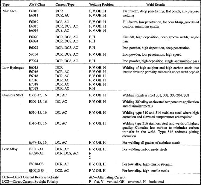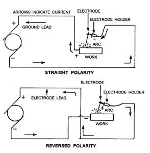 electric-arc welding. The first two digits in the symbol designate the minimum allowable tensile strength in thousands of pounds per square inch of the deposited weld metal. For example, the 60-series electrodes have a minimum tensile strength of 60,000 pounds per square inch, while the 70-series electrodes have a strength of 70,000 pounds per square inch. The third digit of the symbol indicates the joint position for which the electrode is designed. Two numhers are used for this purpose: 1 and 2. Number 1 designates an electrode that can be used for welding in any position. Number 2 represents an electrode restricted for welding in the horizontal and flat positions only. The fourth digit of the symbol represents special characteristics of the electrode, such as weld quality, type of current, and amount of penetration. The numbers range from 0 through 8. Since the welding position is dependent on the manufacturer's characteristics of the coating, the third and fourth numbers are often identified together. Electrode Selection Several factors are critical when you choose an electrode for welding. The welding position is particularly significant. Table 7-2 shows the recommended current types and welding positions for the most common electrodes. As a rule of thumb, you should never use an electrode that has a diameter larger than the thickness of the metal that you are welding. Some operators prefer larger electrodes because they permit faster travel, but this takes a lot of expedience to produce certified welds. Position and the type of joint are also factors in determining the size of the electrode. For example, in a thick-metal section with a narrow vee, a small-diameter electrode is always used to run the frost weld or root pass. This is done to ensure full penetration at the root of the weld. Successive passes are then made with larger electrodes. For vertical and overhead welding, 3/16 inch is the largest diameter electrode that you should use regardless of plate thickness. Larger electrodes make it too difficult to control the deposited metal. For economy, you should always use the largest electrode that is practical for the work It takes about one half of the time to deposit an equal quantity of weld metal from 1/4-inch electrodes as it does from 3/16-inch electrodes of the same type. The larger sizes not only allow the use of higher currents but also require fewer stops to change electrodes. Deposit rate and joint preparation are also important in the selection of an electrode. Electrodes for welding mild steel can be classified as fast freeze, fill freeze, and fast fill. FAST-FREEZE electrodes produce a snappy, deep penetrating are and fast-freezing deposits. They are commonly called reverse-polarity electrodes, even though some can be used on ac. These electrodes have little slag and produce flat beads. They are widely used for all-position welding for both fabrication and repair work FILL-FREEZE electrodes have a moderately forceful are and a deposit rate between those of the fast-freeze and fast-fill electrodes. They are commonly called the straight-polarity electrodes, even though they may be used on ac. These electrodes have complete slag coverage and weld deposits with distinct, even ripples. They are the general-purpose electrode for a production shop and are also widely used for repair work They can be used in all positions, but fast-freeze electrodes are still preferred for vertical and overhead welding. Among the FAST-FILL electrodes are the heavycoated, iron powder electrodes with a soft arc and fast deposit rate. These electrodes have a heavy slag and produce exceptionally smooth weld deposits. They are generally used for production welding where the work is positioned for flat welding. Another group of electrodes are the low-hydrogen type that were developed for welding high-sulfur and high-carbon steel. These electrodes produce X-ray quality deposits by reducing the absorption of hydrogen that causes porosity and cracks under the weld bead. Welding stainless steel requires an electrode containing chromium and nickel. All stainless steels have low-thermal conductivity that causes electrode overheating and improper arc action when high currents are used. In the base metal, it causes large temperature differentials between the weld and the rest of the work, which warps the plate. A basic rule in welding stainless steel is to avoid high currents and high heat. Another reason for keeping the weld cool is to avoid carbon corrosion. There are also many special-purpose electrodes for surfacing and welding copper and copper alloys, aluminum, cast iron, manganese, nickel alloys, and nickelmanganese steels. The composition of these electrodes is designed to match the base metal. The basic rule in selecting electrodes is to pick one that is similar in composition to the base metal. Electrode Storage Electrodes are expensive; therefore, the loss or deterioration through improper handling or storage can become very costly. Always store them in a dry place at room temperature with 50-percent maximum relative humidity. Moisture causes the coating on electrodes to disintegrate and fall off. Low-hydrogen rods are especially sensitive to moisture. After removing these rods from their original packaging, you should store them in a storage space maintained at a temperature between 250F to 400F. Portable or stationary drying ovens are used to store and preserve electrodes at specified temperatures. Care should be taken when handling electrodes because bumping or dropping them can cause the coatings to fall off, rendering the rod useless. Polarity Earlier in this chapter, ac and do current was briefly covered. With ac welding machines, polarity is not a problem. When using do welding machines, you can weld with either straight polarity or reverse polarity. Polarity is the direction of the current flow in a circuit, as shown in figure 7-9. In straight polarity, the electrode is negative and 