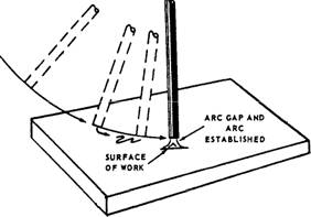 Figure 7-10.-Striking or brushing method of starting the arc. opposite is true and the greatest heat is produced on the negative side. Electrode coatings affect the heat conditions differently. One type of heavy coating may provide the most desirable heat balance with straight polarity, while another type of coating on the same electrode may provide a more desirable heat balance with reverse polarity. Reverse polarity is used in the welding of nonferrous metals, such as aluminum, bronze, Monel, and nickel. Reverse polarity is also used with some types of electrodes for making vertical and overhead welds. You can recognize the proper polarity for a given electrode by the sharp, crackling sound of the arc. The wrong polarity causes the arc to emit a hissing sound, and the welding bead is difficult to control. One disadvantage of direct-current welding is "arc blow." As stated earlier, arc blow causes the arc to wander while you are welding in corners on heavy metal or when using large-coated electrodes. Direct current flowing through the electrode, workpiece, and ground clamp generates a magnetic field around each of these units. This field can cause the arc to deviate from the intended path. The arc is usually deflected forward or backward along the line of travel and may cause excessive spatter and incomplete fusion. It also has the tendency to pull atmospheric gases into the arc, resulting in porosity. Arc blow can often be corrected by one of the following methods: by changing the position of the ground clamp, by welding away from the ground clamp, or by changing the position of the workpiece. |
