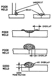 Figure 7-13.-Undercuts and overlaps in welding. Length of Are When an arc is too long, the metal melts off the electrode in large globules and the arc may break frequently. This produces a wide, spattered, and irregular deposit with insufficient fusion between the base metal and the weld (fig. 7-12, view F). When an arc is too short, it fails to generate enough heat to melt the base metal properly, causes the electrode