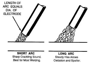 Figure 7-14.-Setting the length of an arc. to stick frequently to the base metal, and produces uneven deposits with irregular ripples. The recommended length of the arc is equal to the diameter of the bare end of the electrode, as shown in figure 7-14. The length of the arc depends upon the type of electrode and the type of welding being done; therefore, for smaller diameter electrodes, a shorter arc is necessary than for larger electrodes. Remember: the length of the arc should be about equal to the diameter of the bare electrode except when welding in the vertical or overhead position. In either position, a shorter arc is desirable because it gives better control of the molten puddle and prevents atmospherical impurities from entering the weld.