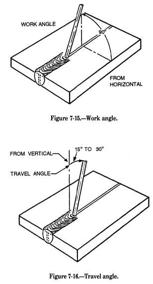 Electrode Angle The angle at which you hold the electrode greatly affects the shape of the weld bead which is very important in fillet and deep groove welding. The electrode angle consists of two positions: work angle and travel angle. Work angle is the angle from the horizontal measured at right angles to the direction of welding (fig, 7-15). Travel angle is the angle in the direction of welding and may vary from 5 to 30 degrees, depending on the welder's choice and conditions (fig. 7-16). Work angle is especially important in multiple-pass fillet welding. Normally, a small variance of the work angle will not affect the appearance or quality of a weld; however, when undercuts occur in the vertical section of a fillet weld, the angle of the arc should be lowered and the electrode directed more toward the vertical section. Travel Speed Travel speed is the rate at which the electrode travels along a weld seam. The maximum speed of welding depends on the skill of the operator, the position of the weld, the type of electrode, and the required joint penetration. Normally, when the travel speed is too fast, the molten pool cools too quickly, locking in impurities and causing the weld bead to be narrow with pointed ripples, as shown in figure 7-12, view D. On the other hand, if the travel speed is too slow, the metal deposit piles up excessively and the weld is high and wide, as shown in figure 7-12, view E. In most cases, the limiting factor is the highest speed that produces a satisfactory surface appearance of a normal weld, as shown in figure 7-12, view A. Breaking the Arc The most commonly used method to break the arc is to hold the electrode stationary until the crater is filled and then slowly withdraw the electrode. This method reduces the possibilities of crater cracks. Reestablishing the Arc When it becomes necessary to reestablish the are (as in a long weld that requires the use of more than one electrode), the crater must first be cleaned before striking the arc. Strike the tip of the new electrode at the forward (cold) end of the crater and establish an arc. Move the arc backward over the crater, and then move forward again and continue the weld. This procedure fills the crater and prevents porosity and slag inclusions. Peening Peening is a procedure that involves lightly hammering a weld as it cools. This process aids in relieving built-up stresses and preventing surface cracking in the joint area; however, peening should be done with care because excess hammering can work harden and increase stresses in the weld. This condition leads to weld embrittlement and early failure. Some welds are covered by specific codes that prohibit peening so you should check the weld specification before peening. |