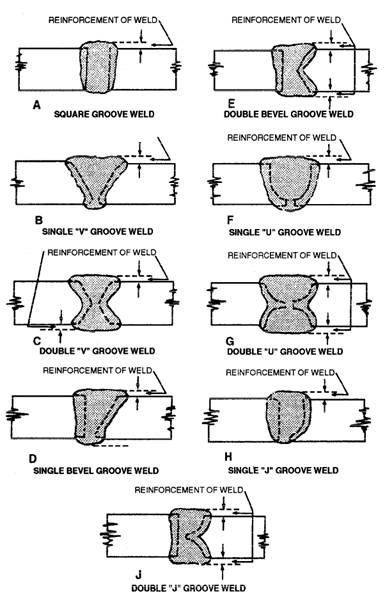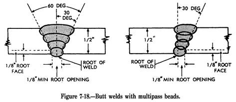 Figure 7-17.-Butt joints in the flat position. FLAT-POSITION WELDING Earlier reexplained that welding can be done in any position, but it is much simpler when done in the flat position. In this position, the work is less tiring, welding speed is faster, the molten puddle is not as likely to run, and better penetration can be achieved. Whenever possible, try to position the work so you can weld in the flat position. In the flat position, the face of the weld is approximately horizontal. Joint Type Butt joints are the primary type of joints used in the flat position of welding; however, flat-position welding can be made on just about any type of joint providing you can rotate the section you are welding on to the appropriate position. Techniques that are useful in making butt joints in the flat position, with and without the use of backing strips, are described below. BUTT JOINTS WITHOUT BACKING STRIPS.- A butt joint is used to join two plates having surfaces in about the same plane. Several forms of butt joints are shown in figure 7-17. Plates up to 1/8 inch thick can be welded in one pass with no special edge preparation. Plates from 1/8 to 3/16 inch in thickness also can be welded with no special edge preparation by welding on both sides of the joint.