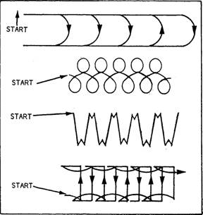 Figure 7-19.-Weave motions used in manual shielded arc welding. Tack welds should be used to keep the plates aligned for welding. The electrode motion is the same as that used in making a bead weld. In welding 1/4-inch plate or heavier, you should prepare the edges of the plates by beveling or by J-, U-, or V-grooving, whichever is the most applicable. You should use single or double bevels or grooves when the specifications and/or the plate thickness requires it. The first bead is deposited to seal the space between the two plates and to weld the root of the joint. This bead or layer of weld metal must be thoroughly cleaned to remove all slag and dirt before the second layer of metal is deposited.
