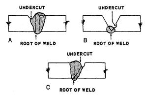Figure 7-20.-Undercutting in butt joint welds. In making multipass welds, as shown in figure 7-18, the second, third, and fourth layers of weld metal are made with a weaving motion of the electrode. Clean each layer of metal before laying additional beads. You may use one of the weaving motions shown in figure 7-19, depending upon the type of joint and size of electrode. In the weaving motion, oscillate or move the electrode uniformly from side to side, with a slight hesitation at the end of each oscillation. Incline the electrode 5 to 15 degrees in the direction of welding as in bead welding. When the weaving motion is not done properly, undercutting could occur at the joint, as shown in figure 7-20. Excessive welding speed also can cause undercutting and poor fusion at the edges of the weld bead. BUTT JOINTS WITH BACKING STRIPS.Welding 3/16-inch plate or thicker requires backing strips to ensure complete fusion in the weld root pass and to provide better control of the arc and the weld metal. Prepare the edges of the plates in the same manner as required for welding without backing strips.