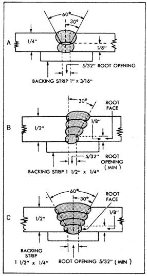Figure 7-21.-Use of backing strips in welding butt joints. For plates up to 3/8 inch thick, the backing strips should be approximately 1 inch wide and 3/16 inch thick. For plates more than 1/2inch thick, the backing strips should be 1 1/2 inches wide and 1/4 inch thick Tack-weld the backing strip to the base of the joint, as shown in figure 7-21. The backing strip acts as a cushion for the root pass. Complete the joint by welding additional layers of metal. After you complete the joint, the backing strip may be "washed" off or cut away with a cutting torch. When specified, place a seal bead along the root of the joint. Bear in mind that many times it will not always be possible to use a backing strip; therefore, the welder must be able to run the root pass and get good penetration without the formation of icicles.