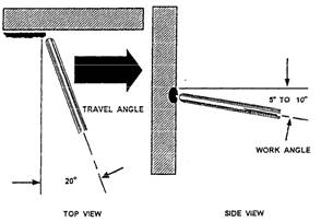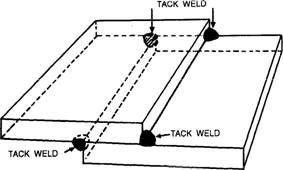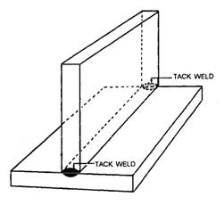 Figure 7-25.-Tack-weld to hold the tee joint elements in place. An inexperienced welder usually finds the horizontal position of are welding difficult, at least until he has developed a fair degree of skill in applying the proper technique. The primary difficulty is that in this position you have no "shoulder" of previously deposited weld metal to hold the molten metal. Electrode Movement In horizontal welding, position the electrode so that it points upward at a 5- to 10-degree angle in conjunction with a 20-degree travel angle (fig. 7-24). Use a narrow weaving motion in laying the bead. This weaving motion distributes the heat evenly, reducing the tendency of the molten puddle to sag. You should use the shortest are length possible, and when the force of the are undercuts the plate at the top of the bead, lower the electrode holder a little to increase the upward angle.