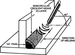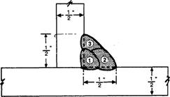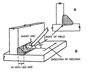 Figure 7-26.-Position of electrode and fusion area of fillet weld on a tee joint. As you move in and out of the crater, pause slightly each time you return. This keeps the crater small and the bead has less tendency to sag. Joint Type Horizontal-position welding can be used on most types of joints. The most common types of joints it is used on are tee joints, lap joints, and butt joints. TEE JOINTS.- When you make tee joints in the horizontal position, the two plates are at right angles to each other in the form of an inverted T. The edge of the vertical plate may be tack-welded to the surface of the horizontal plate, as shown in figure 7-25. A fillet weld is used in making the tee joint, and a short arc is necessary to provide good fusion at the root and along the legs of the weld (fig. 7-26, view A). Hold the electrode at an angle of 45 degrees to the two plate surfaces (fig. 7-26, view B) with an incline of approximately 15 degrees in the direction of welding. When practical, weld light plates with a fillet weld in one pass with little or no weaving of the electrode. Welding of heavier plates may require two or more passes in which the second pass or layer is made with a semicircular weaving motion, as shown in figure 7-27. To ensure good fusion and the prevention of undercutting, you should make a slight pause at the end of each weave or oscillation. For fillet-welded tee joints on 1/2-inch plate or heavier, deposit stringer beads in the sequence shown in figure 7-28.