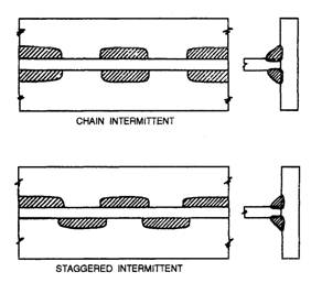 Figure 7-29.-Intermittent fillet welds. Chain-intermittent or staggered-intermittent fillet welds, as shown in figure 7-29, are used on long tee joints. Fillet welds of these types are for joints where high weld strength is not required; however, the short welds are arranged so the finished joint is equal in