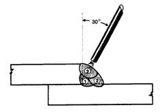 Figure 7-31.-Position of electrode on a lap joint. strength to that of a joint that has a fillet weld along the entire length of one side. Intermittent welds also have the advantage of reduced warpage and distortion. LAP JOINTS.- When you make a lap joint, two overlapping plates are tack-welded in place (fig. 7-30), and a fillet weld is deposited along the joint. The procedure for making this fillet weld is similar to that used for making fillet welds in tee joints. You should hold the electrode so it forms an angle of about 30 degrees from the vertical and is inclined 15 degrees in the direction of welding. The position of the electrode in relation to the plates is shown in figure 7-31. The weaving motion is the same as that used for tee joints, except that the pause at the edge of the top plate is long enough to ensure good fusion without undercut. Lap joints on 1/2-inch plate or heavier are made by depositing a sequence of stringer beads, as shown in figure 7-31, In making lap joints on plates of different thickness, you should hold the electrode so that it forms an angle of between 20 and 30 degrees from the vertical
