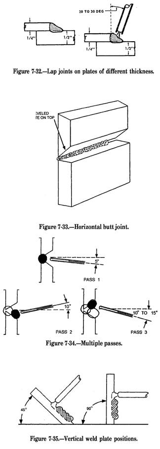 (fig. 7-32). Be careful not to overheat or undercut the thinner plate edge. BUTT JOINTS.- Most butt joints, designed for horizontal welding, have the beveled plate positioned on the top. The plate that is not beveled is on the bottom and the flat edge of this plate provides a shelf for the molten metal so that it does not run out of the joint (fig. 7-33). Often both edges are beveled to forma 60-degree included angle. When this type of joint is used, more skill is required because you do not have the retaining shelf to hold the molten puddle. The number of passes required for a joint depends on the diameter of the electrode and the thickness of the metal. When multiple passes are required (fig. 7-34), place the first bead deep in the root of the joint. The electrode holder should be inclined about 5 degrees downward. Clean and remove all slag before applying each following bead. The second bead should be placed with the electrode holder held about 10 degrees upward. For the third pass, hold the electrode holder 10 to 15 degrees downward from the horizontal. Use a slight weaving motion and ensure that each bead penetrates the base metal. |