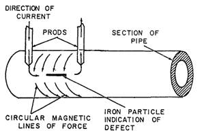 NONDESTRUCTIVE TESTING Nondestructive testing is a method of testing that does not destroy or impair the usefulness of a welded item. These tests disclose all of the common internal and surface defects that can occur when improper welding procedures are used. A large choice of testing devices is available and most of them are easier to use than the destructive methods, especially when working on large and expensive items. Visual Inspection Visual inspection is usually done automatically by the welder as he completes his welds. This is strictly a subjective type of inspection and usually there are no definite or rigid limits of acceptability. The welder may use templates for weld bead contour checks. Visual inspections are basically a comparison of finished welds with an accepted standard. This test is effective only when the visual qualities of a weld are the most important. Magnetic Particle Inspection Magnetic particle inspection is most effective for the detection of surface or near surface flaws in welds.