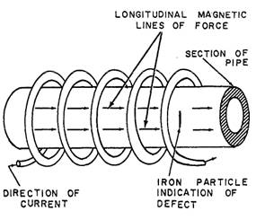 Figure 7-59.-Longitudinal magnetization (coil method). It is used in metals or alloys in which you can induce magnetism. While the test piece is magnetized, a liquid containing finely ground iron powder is applied. As long as the magnetic field is not disturbed, the iron particles will form a regular pattern on the surface of the test piece. When the magnetic field is interrupted by a crack or some other defect in the metal, the pattern of the suspended ground metal also is interrupted. The particles of metal cluster around the defect, making it easy to locate. You can magnetize the test piece by either having an electric current pass through it, as shown in figure 7-58, or by having an electric current pass through a coil of wire that surrounds the test piece, as shown in figure 7-59. When an electric current flows in a straight line from one contact point to the other, magnetic lines of force are in a circular direction, as shown in figure 7-58. When the current flow is through a coil around the test piece, as shown in figure 7-59, the magnetic lines of force are longitudinal through the test piece. When a defect is to show up as a disturbance in the pattern of the iron particles, the direction of the magnetic field must be at right angles to the major axis of the defect. A magnetic field having the necessary direction is established when the current flow is parallel to the major axis of the defect. Since the orientation of the defect is unknown, different current directions must be used during the test. As shown in figure 7-58, circular magnetism is induced in the test piece so you can inspect the piece for lengthwise cracks, while longitudinal magnetism, as shown in figure 7-59, is induced so you can inspect the piece for transverse cracks. In general, magnetic particle inspection is satisfactory for detecting surface cracks and subsurface cracks that are not more than 1/4 inch below the surface. The type of magnetic particle inspection unit commonly used in the Navy is a portable low-voltage unit having a maximum magnetizing output of 1,000 amperes, either alternating or direct current. It is ready to operate when plugged into the voltage supply specified by the manufacturer. The unit consists of a magnetizing current source, controls, metering, three 10-foot lengths of flexible cable, and a prod kit. The prod kit includes an insulated prod grip fitted with an ON-OFF relay or current control switch, a pair of heavy copper contact prods, and two 5-foot lengths of flexible cable. Cable fittings are designed so that either end of the cable can be connected to the unit, to the prods, or to any other cable. The three outlets on the front of the unit make changing from alternating to direct current or vice versa very easy. The outlets are labeled as follows: left is ac, the center is COMMON, and the right is dc. One cable will always be plugged into the COMMON outlet, while the other cable is plugged into either the ac or do outlet, depending upon what type of current the test requires. For most work, alternating current magnetization effectively locates fatigue cracks and similar defects extending through to the surface. When you require a more sensitive inspection to detect defects below the surface, use direct current. You can use the unit with alternating or direct current in either of two ways: (1) with prods attached to the flexible cable and used as contacts for the current to pass into and out of a portion of the test piece, setting up circular magnetization in the area between the prods contact points, as shown in figure 7-58; or (2) with the flexible cable wrapped around the work to form a coil that induces longitudinal magnetism in the part of the workpiece that is surrounded by the coiled cable (fig. 7-59)0 Although you can use either of these two methods, the prod method is probably the easier to apply. Inmost instances, it effectively serves to detect surface defects. With the prods, however, only a small area of the test piece can be magnetized at any one time. This magnetized area is limited to the distance between prod contact points and a few inches on each side of the current path. To check the entire surface, you must test each adjacent area by changing the location of the prod contact points. Each area of the test piece must be inspected twiceonce with the current passing through the metal in one direction and then with the current passing through the metal in a direction at right angles to the direction of the first test. One of the advantages of the prod method is that the current can be easily passed through the metal in any desired direction. Thus, when a given area is suspect, magnetic fields of different directions can be induced during the test. The prod method is accomplished by adjusting the unit for a current output suitable for the magnetizing and testing of any particular kind of metal. The current setting required depends on the distance between prod contact points. With the prod kit that is supplied with the unit, the space between prod contact points is 4 to 6 inches. A current setting between 300 and 400 amperes is satisfactory when the material thickness is less than 3/4 inch. When the material thickness is over 3/4 inch, use 400 to 600 amperes. When the prod contact points are closer together, the same magnetic field force can be obtained with less current. With prods constantly at the same spacing, more current will induce a greater field strength. After adjusting the unit, place the prods in position. Hold them infirm contact with the metal and turn on the current. Then apply magnetic particles to the test area with the duster bulb and look for any indicator patterns. With the current still on, remove the excess particles from the test area with a blower bulb and complete the inspection. Do not move the prods until after the current has been turned off. To do so could cause the current to arc, resulting in a flash similar to that occurring in arc w