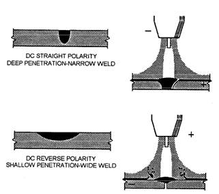 Figure 8-4.-Effects of polarity on the weld. also turn the main welding current on and off at the same time. This not only allows the operator to start and stop without leaving the work but also to adjust the current while welding. Most of these welding machines can produce both ac and do current. The choice of ac or do depends on the welding characteristics required. DIRECT CURRENT.- As you learned in chapter 7, a direct-current welding circuit maybe either straight or reverse polarity. When the machine is set on straight polarity, the electrons flow from the electrode to the plate, concentrating most of the heat on the work With reverse polarity, the flow of electrons is from the plate to the electrode, thus causing a greater concentration of heat at the electrode. Because of this intense heat, the electrode tends to melt off, therefore, direct-current reverse polarity (DCRP) requires a larger diameter electrode than direct-current straight polarity (DCSP). The effects of polarity on the weld are shown in figure 8-4. Notice that DCSP produces a narrow, deep weld. Since the heat is concentrated on the work, the welding process is more rapid and there is less distortion of the base metal. Overall, straight polarity is preferred over reverse polarity because you can achieve better welds. DCRP forms a wide and shallow weld and is rarely used in the GTAW process. The exception to this is when it is used to weld sections of aluminum or magnesium. DCRP has excellent cleaning power that results from the