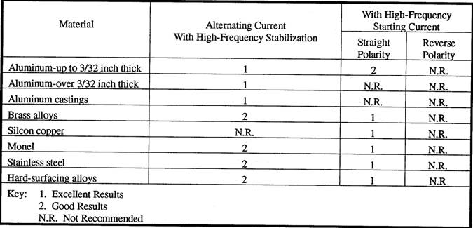 You can use table 8-1 as a guide for selecting the current for welding some of the more common metals. For more specific information, refer to the operator's manual for the specific machine you are using. |