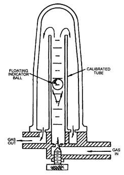 Figure 8-11.-Cross section of flowmeter. for GMA/GTA show the flow of shielding gas in cubic feet per hour (cfh) or liters per minute (lpm). Regulators used for GMA/GTA welding have a flowmeter instead of a working pressure gauge along with the cylinder pressure gauge. See figure 8-10. The flowmeter consists of a plastic or glass tube that contains a loosely fitting ball. As the gas flows up the tube, it passes around the ball and lifts it up. The more Table 8-4.-Selection of Shielding Gases for Various GMAW and GTAW Applications