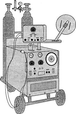 GAS METAL-ARC WELDING-GMAW The gas metal-arc welding process (GMAW), often called MIG, has revolutionized arc welding. In this process, a consumable electrode (in the form of wire) is fed from a spool through the torch (welding gun) at a preset controlled speed. As the wire passes through the contact tube of the gun, it picks up the welding current. The consumable wire electrode serves two functions: it maintains the are and provides filler metal to the joint. The method of delivery of the filler metal allows GMAW welding to be basically a one-handed operation which does not require the same degree of skill as GTAW. Figure 8-23 shows the basic principle of gas metal-arc welding. An important factor in the GMA welding process is the high rate at which metal can be deposited. This high rate of metal deposition and high speed of welding results in minimum distortion and a narrow heat-affected zone. When you are deciding whether to use GTA or GMA welding, the thickness of the material should be a deciding factor. GMAW is often chosen for welding thicker material. Like GTA welding, gas metal-arc welding also uses a shielding gas to protect the weld zone during welding. The inert gas is fed through the gun into the weld zone and prevents atmospheric contamination. GMAW offers many of the advantages of GTAW. Since there is no flux, GMA welds are clean and there is no slag to remove. GMAW enables you to produce sound welds in all positions quickly. Now let's take a look at the equipment you will use for GMA welding. GMA WELDING EQUIPMENT AND SUPPLIES Gas metal-arc welding equipment basically consists of four units: the power supply, the wire feeding mechanism, the welding gun (also referred to as the torch), and the gas supply. Figure 8-24 shows atypical GMA welding outfit. Welding Machine When you use a conventional type of welding machine for GMA welding, the voltage varies depending on the length of the arc. Whenever the nozzle-to-work distance changes, the are length and the voltage changes. The only way to produce uniform welds with this type of power source is to maintain the are length and voltage at a constant value. Besides producing nonuniform welds, this inconsistent voltage can cause the wire to burn back to the nozzle. A constant voltage (CV) power source was developed to overcome the inconsistent voltage characteristics of a conventional welding machine, (See fig. 8-25). It can be either a do rectifier or motor generator that supplies current with normal limits of 200 to 250 amperes. The CV type power source has a nearly flat voltampere characteristic. This means that the machine maintains the same voltage regardless of the amount of current used. With this type of power source, you can change the wire-feed speed over a considerable range without causing the wire to burn back to the nozzle. When the wire-feed speed is set at a specific rate, a proportionate amount of current is automatically drawn. In other words, the current selection is based on the wire-feed speed. When the wire is fed faster, the current increases; when it is fed slower, the current decreases. With this type of power supply, variations in