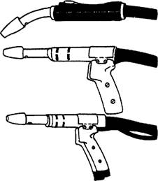 Figure 8-26.-GMA welding guns. shown in figure 8-26. When using these guns, the wire is fed to the torch by an automatic wire feeding machine which pushes the wire through a flexible tube to the arc point. Figure 8-27 shows another type of GMA welding gun that Steelworkers could use. This model incorporates the drive motor and a small spool of wire inside the gun. This type of gun is attached directly to the welding unit and gas supply, eliminating the need for a separate control unit and wire drive assembly. As with the GTA welding torch, the torch nozzle must be kept clean at all times. Also, you should clean the tube through which the electrode wire passes each time the electrode reel is changed. Shielding Gas In gas metal-arc welding, as with gas tungstenarc welding, the shielding gas can have a major effect on the properties of the base metal. Some of the shielding gases commonly used with the GMA process are pure argon, argon-helium, argon-oxygen, argoncarbon dioxide, and carbon dioxide. Refer to table 8-4 for a selection of shielding gases recommended for various metals for both the GMA and GTA welding processes. The smoothness of operation, weld appearance, weld quality, and welding speeds are affected indifferent ways with each type of metal, thickness, and gas mixture. ARGON.- Earlier in this chapter, we said that argon provides greater cleaning action than other gases. Because it is heavier than air, argon blankets the weld from contamination. Also, when you are using argon as a shielding gas, the welding arc tends to be more stable. For this reason, argon is often used in combination with