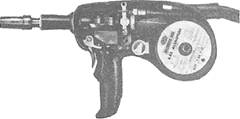Figure 8-27.-GMA welding torch with wire feed motor and wire spool inside. other gases for arc shielding. Argon reduces spatter by producing a quiet arc and reducing arc voltage that results in lower power in the arc and thus lower penetration. The combination of lower penetration and reduced spatter makes argon desirable when welding sheet metal. Pure argon is seldom used for arc shielding except in welding such metals as aluminum, copper, nickel, and titanium. The use of pure argon to weld steel usually results in undercutting, poor bead contour, and the penetration is somewhat shallow. ARGON-OXYGEN.- Small amounts of oxygen added to argon can produce excellent results. Normally oxygen is added in amounts of 1, 2, or 5 percent. When oxygen is added to argon, it improves the penetration pattern. It also improves the bead contour and eliminates the undercut at the edge of the weld. You use argon-oxygen mixtures in welding alloy steels, carbon steels, and stainless steel. HELIUM.- Helium, like argon, is an inert gas. But there are few similarities between the two gases. Argon is heavier than air and helium is lighter than air. Helium has a high-voltage change as the arc length changes. When you use helium for GMA welding, more arc energy is lost in the arc itself and is not transmitted to the work In the section on GTA welding, we said that helium produces good penetration and fast welding speeds. For GMA welding, the opposite is true. In GMA welding, helium produces a broader weld bead, but shallower penetration. Because of its high cost, helium is primarily used for special welding tasks and for welding nonferrous metals, such as aluminum, magnesium, and copper. It is also used in combination with other gases. CARBON DIOXIDE (CO2).- Argon and helium gases are composed of single atoms. Carbon dioxide, on the other hand, consists of molecules. Each molecule contains one carbon atom and two oxygen atoms. At Table 8-6.-Recommended Wire Diameters for GMA Welding Using Welding Grade CO,and a Wire Stick-out of 1/4 to 3/8 of an Inch