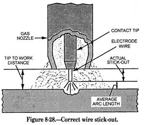 0.045-inch or 1/16-inch diameter wires. For thicker metals, larger diameter electrodes may be required. As you learned earlier, the position of welding is a factor that must be considered. For instance, when you are welding in the vertical or overhead positions, you normally use smaller diameter electrodes. Special attention must be given to ensure the wire is clean. Unsound welds result from the use of wire that is contaminated by oil, grease, dust, or shop fumes. You can obtain the best welding results with wire that has just been taken out of its carton. Wire should be stored in a hot locker or in a warm dry area, and should be kept covered. If welding is stopped for a long period of time, you should remove the wire and place it in its original carton to prevent contamination. WIRE STICK-OUT.- In gas metal-arc welding, wire stick-out refers to the distance the wire extends from the nozzle of the gun (fig. 8-28). The correct amount of wire stick-out is important because it influences the welding current of the power source. Since the power source is self-regulating, the current output is automatically decreased when the wire stick-out increases. Conversely, when the stick-out decreases, the power source is forced to furnish more current. Too little stickout causes the wire to fuse to the nozzle tip, which decreases the tip life. For most GMA welding, the wire stickout should measure from 3/8 to 3/4 of an inch. For smaller (micro) wires, the stick-out should be between 1/4 and 3/8 of an inch. WIRE-FEED SPEED.-As we stated earlier, you can adjust the wire-feed drive motor to vary the wire-feed speed. This adjustment is limited to a definite range, depending on the welding current used. (See table 8-6). The wire-feed speed is measured in inches per minute (ipm). For a specific amperage setting, a high wire-feed speed results in a short arc, whereas a low speed produces a long arc. You use higher speeds for overhead welding than with flat-position welding. As with any other welding process, SAFETY is extremely important. A welding hood like the one used in shielded metal-arc welding should be used for gas metal-arc welding. The correct shade of lens depends on the intensity of the arc. Chapter 3 provides a chart of recommended lens shades based on the current setting of the machine. Eye fatigue indicates you should use a different shade of lens or there is leakage around the protective filter glass. In addition to the welding hood, protective clothing, such as gloves and an apron, should be worn. Bare skin should never be exposed to the rays of the welding arc because it could result in painful burns. |