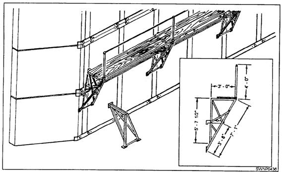 Figure 10-26.-Portable scaffolding used in assembly of structures on a pier. the following: 3x7, 3x12, 4x7, 4x12, 5x12, 6x18, and 10x30 barges. The conventional pontoon barge, in sizes up to and including the 6x18 barge, is designed to carry its rated load with 1' of freeboard or a load concentrated at the center point that is heavy enough to bring the deck awash. The 3x7 pontoon barge is a general-purpose structure that can be used as necessary in lighterage and ferrying operations. Cargo transport can be accomplished by tow, or the barge can be self-propelled by mounting a propulsion unit on the end without fenders. A 3x7 barge with a propulsion unit is shown in figure 10-27. The 3x12 pontoon ramp barge is ordinarily used for transporting cargo and equipment and has proved suitable for general use in amphibious operation. The sloping bow end with ramps attached permits beaching the barge under its own power. And also it helps to unload tractors and equipment that will be used to assist in forming a causeway pier. Four 3x12 barges can be side-loaded on an LST for side-carry to the assault area, or the barges can be loaded in the well deck of an LSD or deck-loaded on an LST. The 4x7 pontoon barge is similar in all respects to the 3x7 barge, except it is one string wider. Although this is a general-purpose barge used principally for lighterage operations, it is suitable for any transportation task within its capacity. The 4x12 pontoon barge is a general-purpose structure that can be used in lighterage operations either by towing or as a self-propelled structure by the addition of propulsion. The 5x12 pontoon barge is one string wider than the 4x12 barge but similar in all other respects. It is particularly suitable for mounting a crawler crane with a lifting capacity ranging from 20 tons at a 12' radius to 7 tons at 55'. This barge can also be used as a general-purpose structure and can be used in lighterage operations as a self-propelled structure by the addition of propulsion units. The 6x18 pontoon barge is the second largest barge in the P-series pontoon system. Installation of propulsion units permits its use in lighterage operations for transporting loads (cargo, vehicles, and personnel) up to 250 tons. By the addition of accessories and equipment, the barge can be converted into a 1,500-barrel fuel storage barge (fig. 10-28). Also, by installing heavy-duty hinges, the barge can be converted into a wharf or used for outfitting and repair of smaller structures when placed on its deck. The 10x30 pontoon barge is the largest barge in the pontoon system. It was developed primarily for mounting a 100-ton derrick (See fig. 10-29.) The barge, however, is adaptable to other uses. With propulsion units attached, it can serve as a lighterage barge in transporting over 800 tons of cargo at one time from ship to shore or dock. The barge can also be