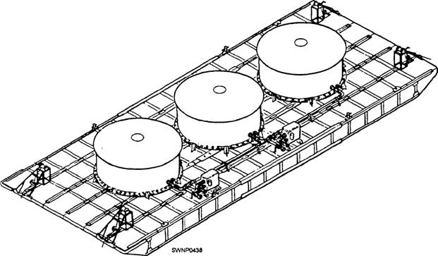 Figure 10-28.-A 1500 barrel , 6x18 fuel storage barge. used as a pier or wharf or, by installing heavy hinges, could be connected to any existing pontoon wharf to enlarge or extend that structure. Essentially, tugs are barges equipped with outboard propulsion units and the accessories required for the operations to be performed. The P-series equipment tugs are widely adaptable and can be used for towing, causeway tending, placing and retrieving