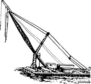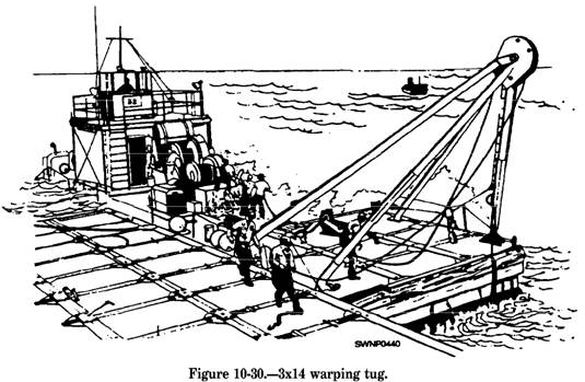 Figure 10-29.-100-ton derrick mounted on a 10 x 30 barge. anchors, salvage operations, assisting in the installation and recovery of fuel systems, and other services. The 3x14 warping tug shown in figure 10-30 is equipped with two outboard propulsion units. The after end of the center string incorporates an anchor housing to accommodate the 2,500-pound mooring anchor and also holds the anchor wire away from the propulsion screws. An A-frame, mounted on the bow of the tug, stands approximately 13' above the deck of the barge. A double-drum winch is mounted near the center of the barge. A line from the after drum is fairlead to the deck and back to the anchor astern, while the line from the forward drum is run over a sheave in the top of the A-frame and is used for lifting over the bow or pulling from the bow of the warping tug. The winch is mounted on a welded steel cross-braced frame. Standard equipment for the tug also includes M147 double bitts and navigation lights. The warping tug is approximately 90' long and 21' wide, has a stem draft of 48", a bow draft of 18", and a speed of 6 1/2 knots. The 3x14 warping tug replaces the 3x12 tug throughout the pontoon system. The only difference in these two is that the 3x14 tug is longer by two P1 pontoons and incorporates new style winches with lines feeding off horizontally laid drums.