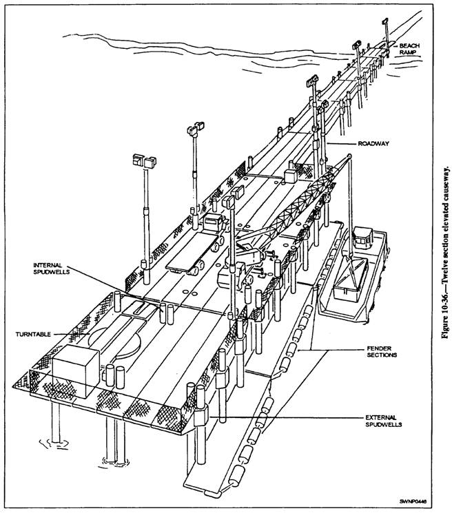 ELEVATED CAUSEWAY SECTIONS The elevated causeway pier facility (ELCAS) provides a link between lighterage and the beach by bridging the surf zone. The standard ELCAS consists of six 3x15 approach or roadway sections and six 3x15 pierhead sections (fig. 10-36). The pierhead is two sections wide by three sections long. Since the facility is modular, it may be expanded by enlarging the pierhead and/or adding approach sections. The basic component of the ELCAS is the 3 x 15 intermediate causeway section that is converted to the elevating mode by the addition of spudwells. Spudwells provide the attachment between the causeway deck and the supporting piling. Internal spudwells (fig. 10-37) are used where the full width of the causeway section is required for traffic and to support the fender piles along the fender side of the pierhead. The internal spudwell incorporates four grooved connection pins that are inserted into four receiver boxes attached to the side of the causeway. Two guillotines are lowered into the pin grooves behind the receiver boxes to secure the spudwell to the section. A steel-angled locking key is used to lock the guillotine into place. External spudwells (fig. 10-38)
