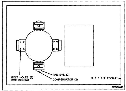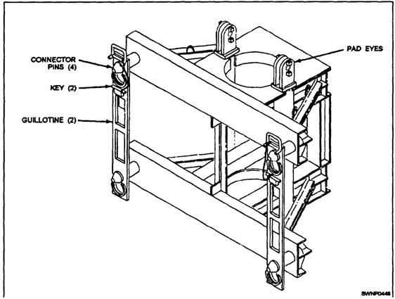 Figure 10-38.-External Spudwell. are used in the outboard strings of pierhead sections, where side to aide connection with another section is required, and at load-bearing points, such as under the container handling crane. The external spudwell is fabricated into a frame having the same overall dimensions as a PI pontoon. It is interchangeable with