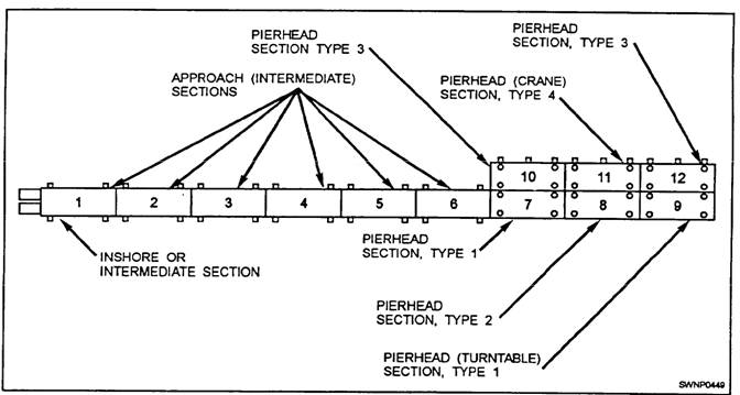 Figure 10-39.-Types and positions of causeway sections in the ELCAS. the PI pontoon and uses the same attaching hardware. The ELCAS consists of four distinct parts as follows: 2 The PIERHEAD is made up of four types of sections. It is the offshore section of the ELCAS and supports cargo unloading functions. The pierhead includes a crane installation for off-loading lighterage and a turntable for turning trucks around on the causeway. 2 The FENDER SECTIONS provide an interface between the pierhead and the lighterage. 2 The ROADWAY provides for two-way traffic between the pierhead and the beach. 2 The BEACH RAMP provides access from the beach to the ELCAS. The types of sections used and their locations are shown in figure 10-39. |