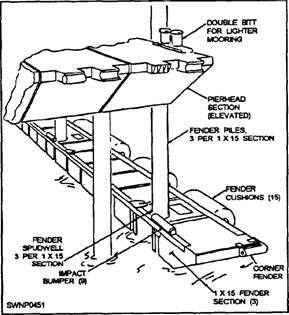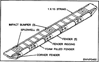 Figure 10-40.-ELCAS fender system details The type 4 pierhead section, which supports the container handling crane, contains seven internal and three external spudwells. Six reinforced PI pontoons are also included. CONSTRUCTION OF FENDER SECTIONS A fender section is a 1'x15' structure incorporating three fender spudwells (fig. 10-40). Fender piles are driven through the fender spudwells after the causeway is elevated (fig. 10-41). The fender section can then rise and fall on' the piling. A series of foam-filled fenders are strung on the outboard side of the fender system to absorb impact from lighterage. Since it is only one pontoon wide, the fender system uses P5 pontoons as end-to-end connections instead of the P8.