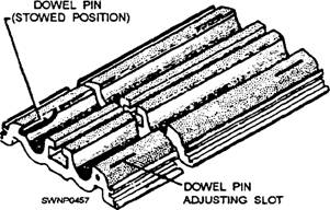SATS Field Installation Sequence The sequence of laying matting for a runway where a guide rail for a catapult system is not required is not the same as for a runway where a guide rail is required. Figure 11-5 shows you what a guide rail looks like. When a catapult facility is used with a SATS installation, a guide rail is needed to provide stability to the dolly and the aircraft during the launch. The guide rail is supplied in 9- and 10-foot lengths and has connectors on both sides to mate with the mat end connectors. A U8-inch rubber seal is installed between each section to provide for thermal expansion and to prevent debris and soil from coming up between the rail sections. Dowel pins are used between two holes in the mats at each end of the guide rails to maintain alignment of the sections. The guide rail is installed concurrently with the mat field, and standard mat-locking bars are used to secure it to the mats. NOTE: The catapult and arresting system is not available currently in the ABFC System. However, it was originally designed for the ABFC System and could be used in the future; therefore, information on guide rails is provided.